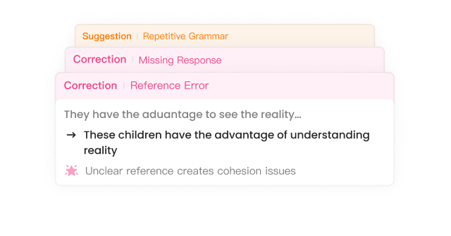 Detailed review showing correction cards with suggestions and corrections